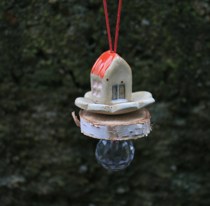2 handgemachte Perlen, 1 Birkenholzscheibe, 1 kleiner Kristall: Länge ca. 6,5 cm